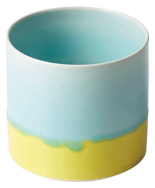 見ているだけで心が元気に晴れるような澄んだ空色に鮮やかビタミンカラー。二色の釉薬のかけわけ部分は、ひとつひとつ違う表情が楽しめます。大胆カラーながらも繊細な京都の職人技が光る完全ハンドメイドカップ。
